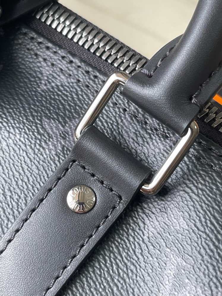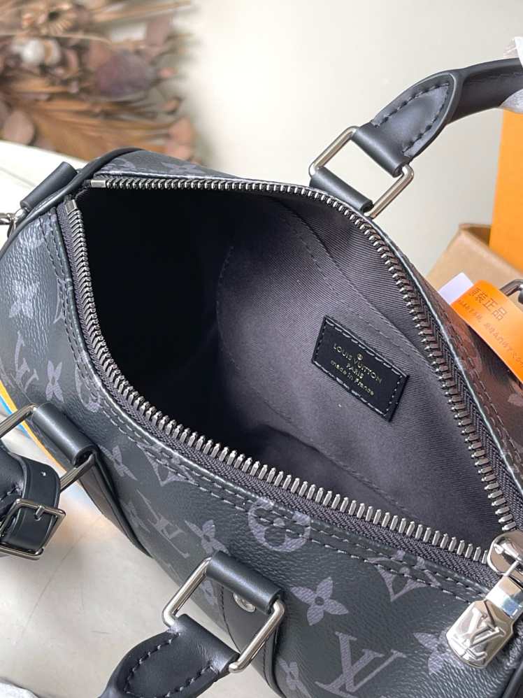 P01942黑花丝印 顶级原单 变码芯片163C 男包枕头包 本款 Keepall 25 手袋 取材 Monogram Eclipse Reverse 帆布,展现路易威登经典图案的优雅重绎。加固饰带和皮革名牌延续 Keepall 系列的标志性元素,拉链开合令个人物品安全随行尺寸25.0 x 15.0 x 11.0cm (长 x 高 x 宽)