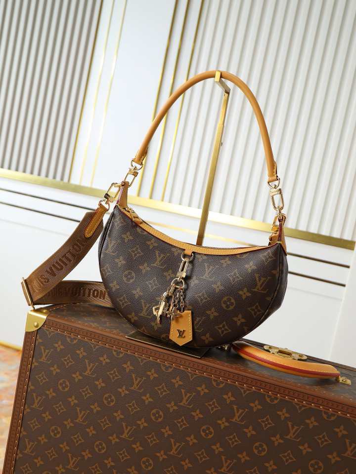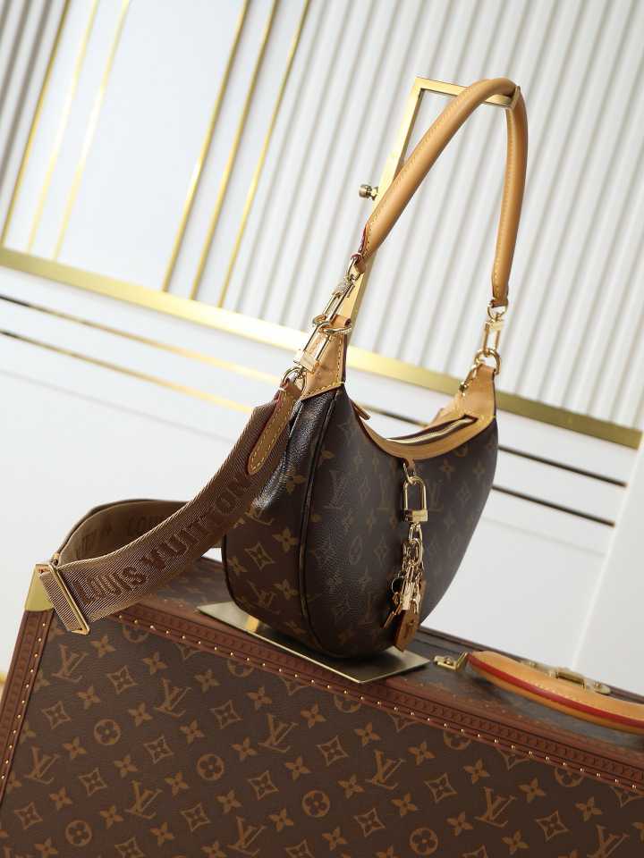 【163C01动态芯片】顶级原单?P¥43 ??全钢五金???? Looping 手袋从 2022 Cruise 早春系列的 Loop 手袋汲取灵感,以 Monogram 帆布演绎 1990 年代风尚。耀目金属件和可拆卸玲珑装饰丰富细节,织物肩带实现昼夜场合的斜挎选择,系上光滑 Toron 手柄即可肩背或手提。Monogram 涂层帆布一牛皮革饰边一织物内衬一金属件一拉链开合一可拆卸标识装饰一钥匙包一挂锁和钥匙一可收纳智能手机、钥匙、Sarah 钱夹和耳机一肩带:可拆卸,可调节!!型號:M12939;尺寸:28x15x7CM