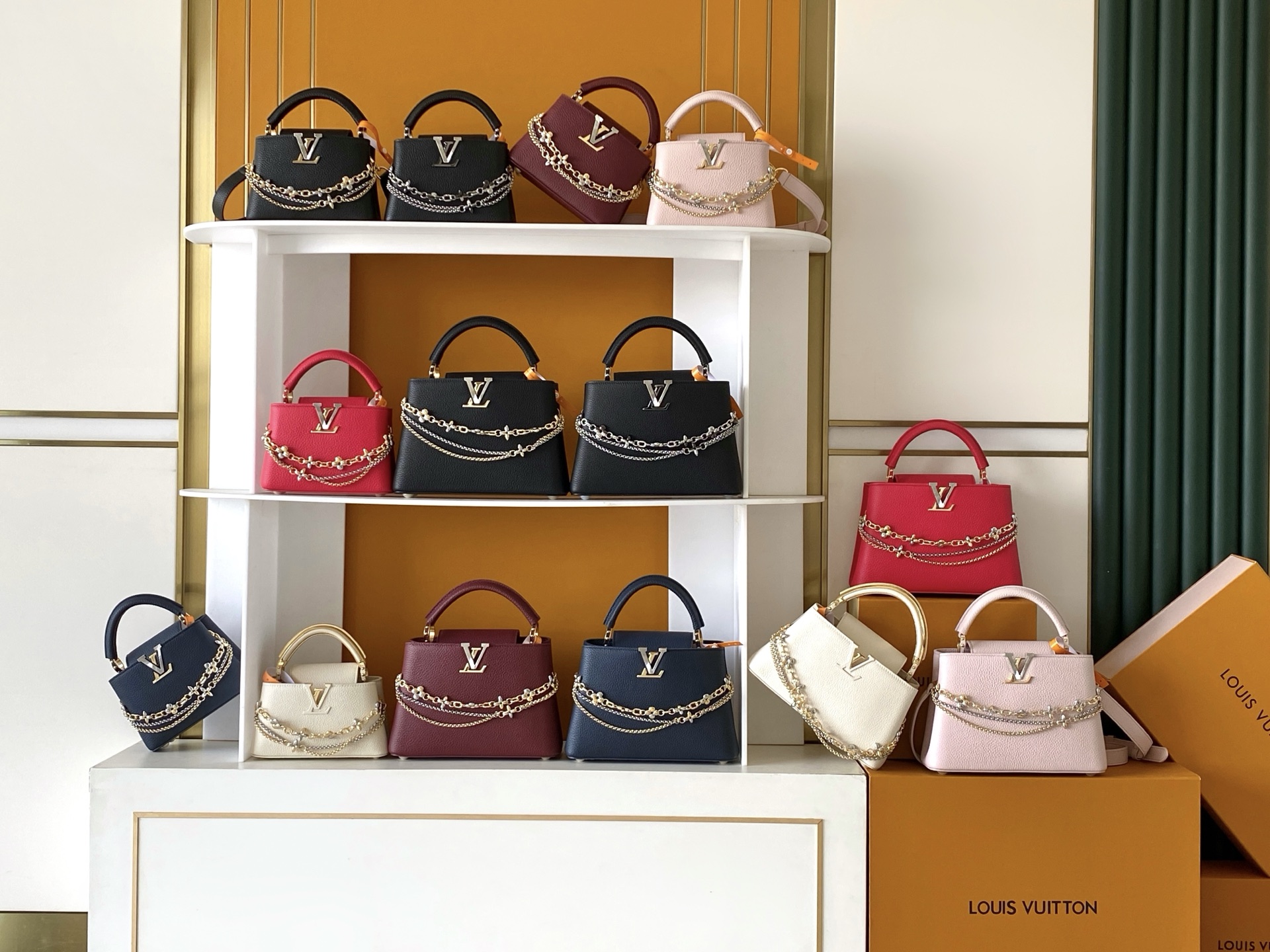 ??M27035蓝色M27034紫红 M27039粉色 M26507西瓜红 M26351黑色白丽 M26814黑色 M26345米白横版Capucines Mini是一款适用于日间与夜晚场合的精致配饰。它采用由品牌珠宝启发的无限链设计,材质选用本季标志性深紫色色调的塔维尔隆皮革制成。双重镀锌五金细节,包括以放射状排列,反射光线的太阳纹工艺呈现的标志性LV首字母,增添了几分奢华感。可拆卸的肩带设计,让你既能将其作为肩包佩戴,斜挎于一侧肩头,亦可手提于顶部手柄处。 21x13.6x8厘米(长x高x宽) 27 x 17.3 x 9 (厘米) ((长 x 高 x 宽) 22 x 12 x 8 (厘米) ((长 x 高 x 宽) 横版白色 。托里昂皮革.Toryong皮革饰边。牛皮内衬 。金色与银色五金件 两种佩戴方式:可将翻盖收起或拉出。带一个平口袋的分隔内衬。底部四金属底座,用于保护 。存储:智能手机,Capucines紧凑钱包,钥匙。肩带:可拆卸,长度可调节 。肩背时最小肩带长度:46.5厘米 。肩背时最大肩带长度:54.0厘米手柄:简约