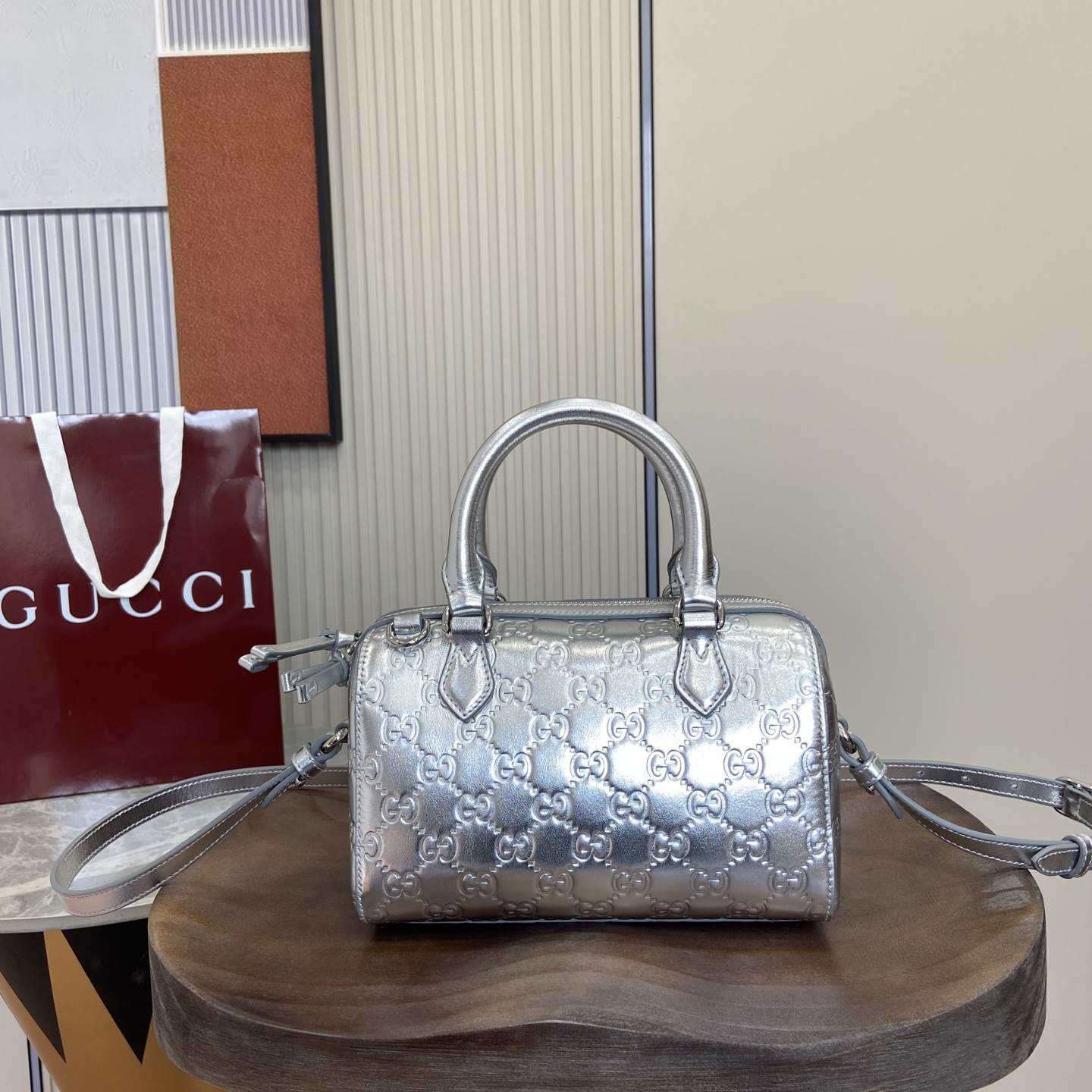 。【配全套包装】??GG Emblem系列焕新演绎品牌经久不息的优雅风范与精湛工艺,选用金属质感款式新意诠释标志性GG图案,配以同质感皮革滚边,令整体设计更臻完满。 银色金属质感GG漆皮 银色金属质感皮革滚边 银色调配件 棕色棉麻混纺衬里 内部:开口口袋 提手:10.5厘米高 可调节皮革肩带:高度:47厘米 - 53厘米;长度:112厘米 - 127厘米 拉链开合 型号:848889。 尺寸:20.5厘米(宽)x 14厘米(高)x 11.5厘米(深) 重量:约0.45千克 颜色:银色/压花。 意大利创作