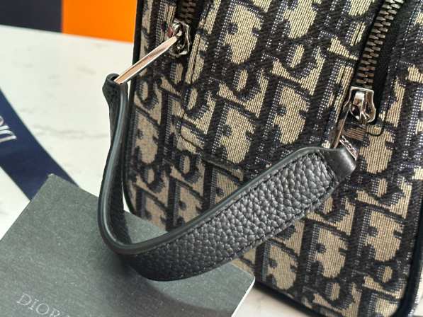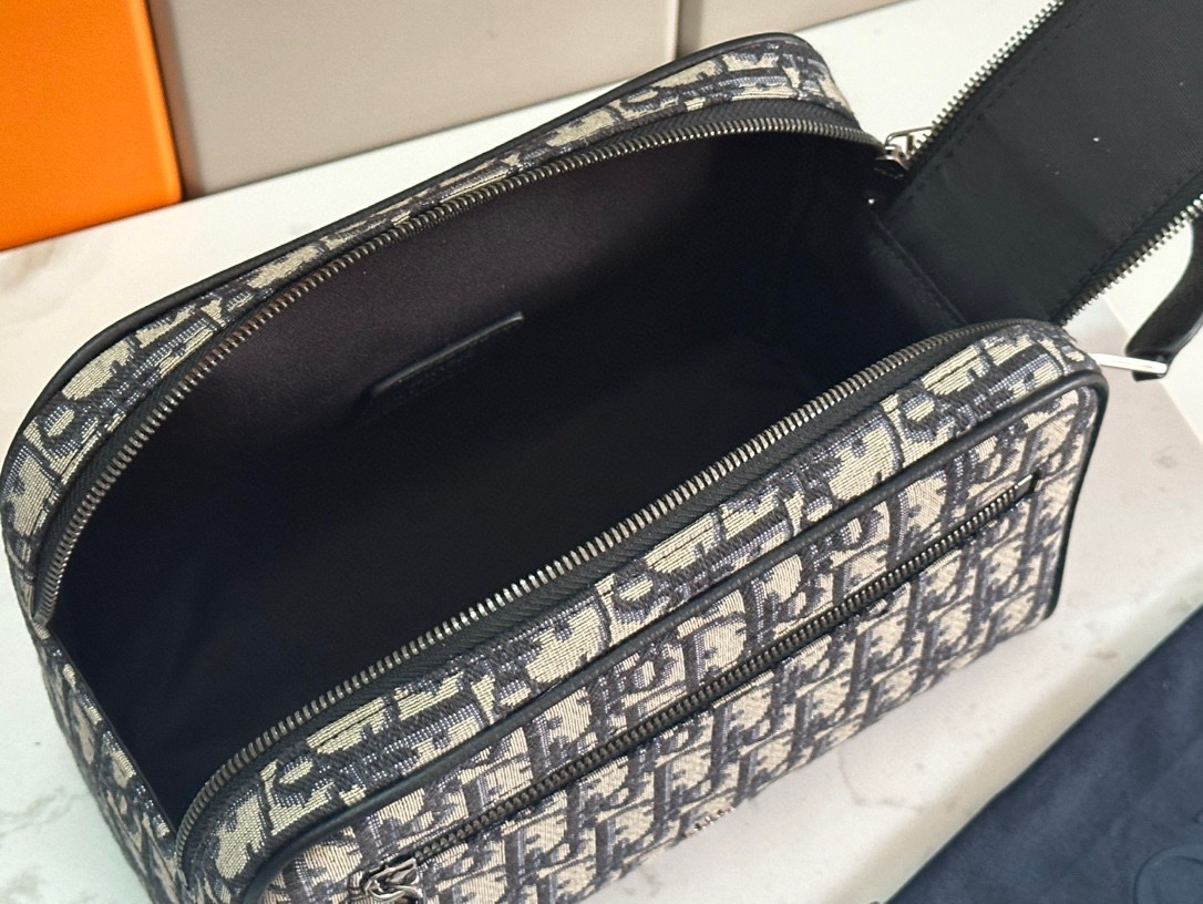 这款洗漱包是二零二四春季男装系列新品,融合实用功能与简约设计。采用米色和黑色 Oblique 印花面料精心制作,饰以黑色粒面牛皮革饰边,正面点缀以 Dior 标志。设有正面拉链口袋、一个宽敞的拉链隔层,以及两个贴袋。配备皮革手柄,可手拿或放入各式手袋中。 米色和黑色 Oblique 印花面料 黑色粒面牛皮革 正面饰以金属覆层黄铜 Dior 标志 内侧饰以 Dior 标志 双拉链开合,带手柄 内部贴袋和正面拉链口袋 内含防尘袋 意大利 型号:227 黑布 蓝布 尺寸:24.5 x 14.5 x 13 厘米(长 x 高 x 宽) 重量:约 306 克