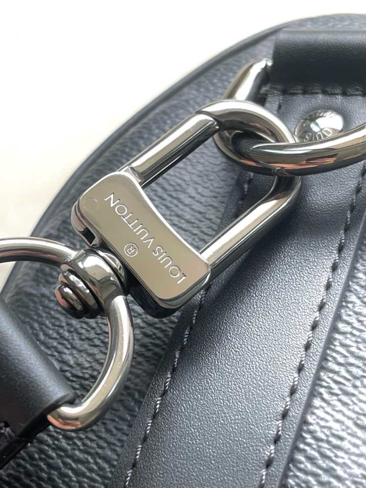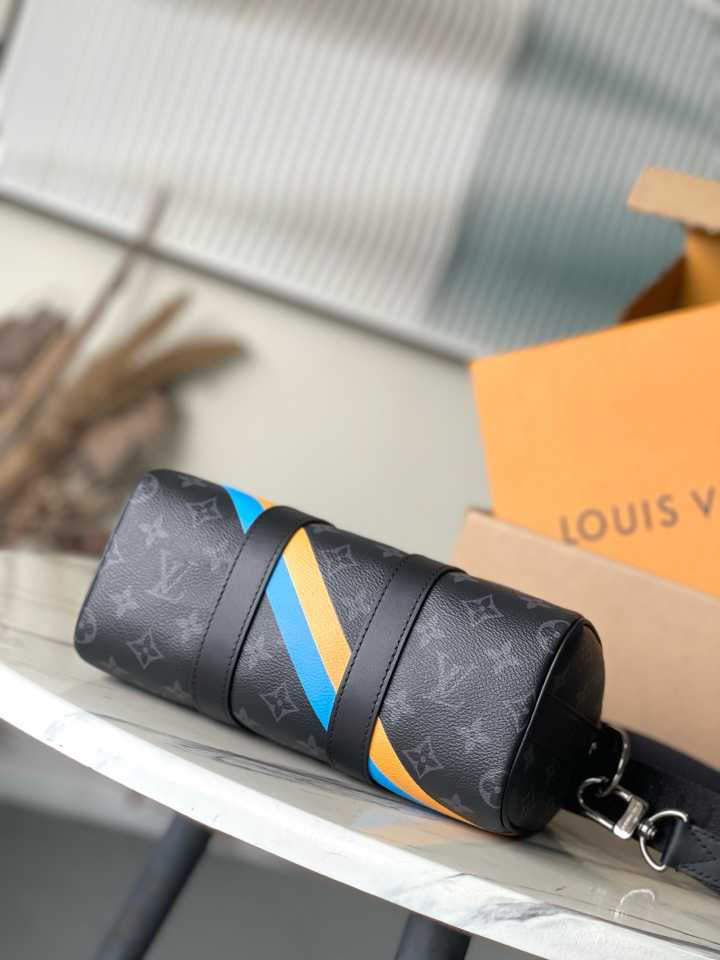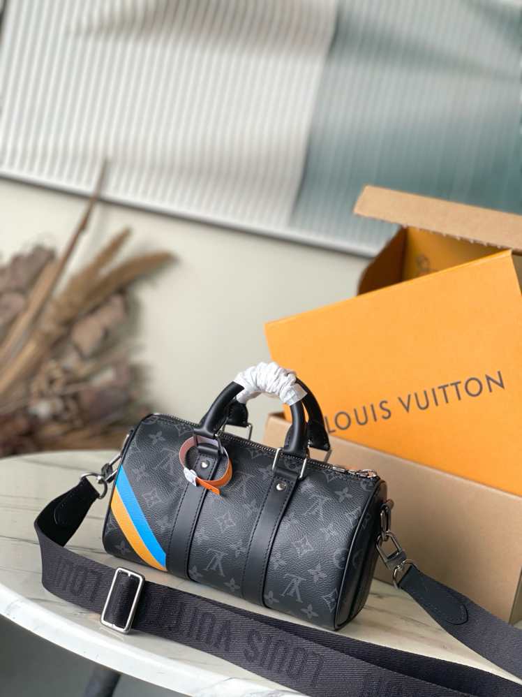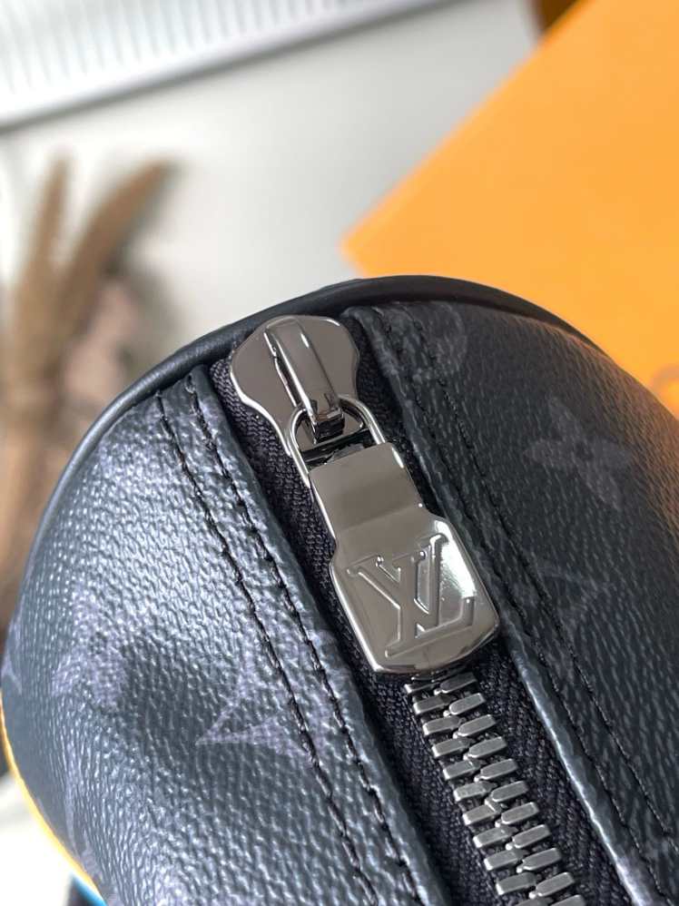 P01942黑花丝印 顶级原单 变码芯片163C 男包枕头包 本款 Keepall 25 手袋 取材 Monogram Eclipse Reverse 帆布,展现路易威登经典图案的优雅重绎。加固饰带和皮革名牌延续 Keepall 系列的标志性元素,拉链开合令个人物品安全随行尺寸25.0 x 15.0 x 11.0cm (长 x 高 x 宽)