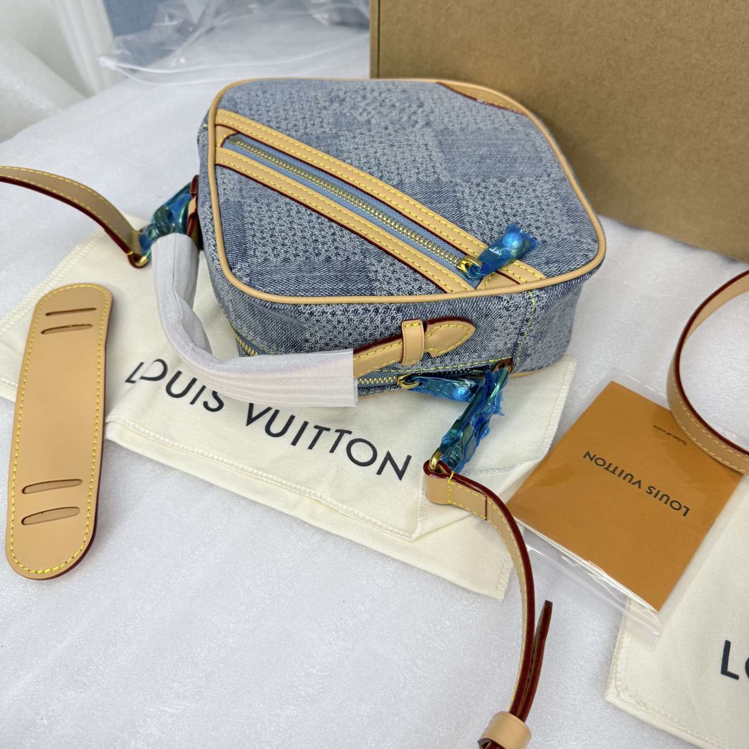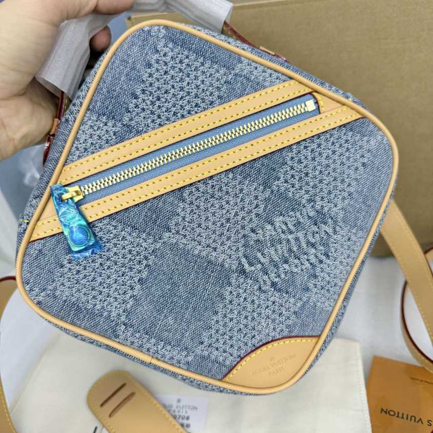 顶级原单???全钢五金????本款 Chess 邮差包的别致构型致意品牌经典 Damier 格纹,以 Damier Denim 3D 棉质帆布呈现 Pharrell Williams 对 Damier 元素的夏日演绎。GOTS(全球有机纺织品标准)认证的棉料带来舒软质感,珠饰拉链头增添雅致气息。Damier Denim 3D 棉质帆布一牛皮革饰边一织物内衬一金属件一拉链开合一主隔层一内贴袋一正面拉链外袋一珠饰拉链头一肩带:可拆卸,可调节!!型號:N40706;尺寸:24x24x8CM